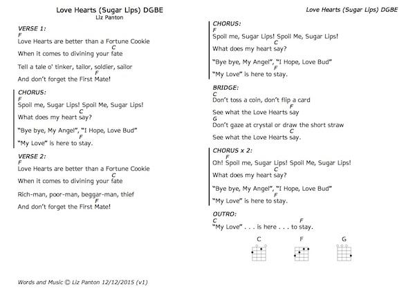 In all these examples I am going to use a song that I have written: “Love Hearts (Sugar Lips)”. Firstly, I do not need to ask anyone’s permission – because the copyright is mine. Secondly, nobody can complain that the lyrics or chords are wrong. Well, they can try but they won’t get very far with that. There is a later version but . . . Thirdly, I know that Jim Carey is going to include this version in the next edition of Jim’s ukulele songbook, so providing versions for other tunings seems a helpful thing to do.