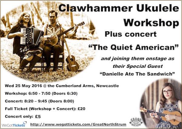 By tonight I should have a better idea of how to play Clawhammer Ukulele and have been knocked out by the Concert, The Quiet American with a Special Guest Appearance by Danielle Ate The Sandwich!